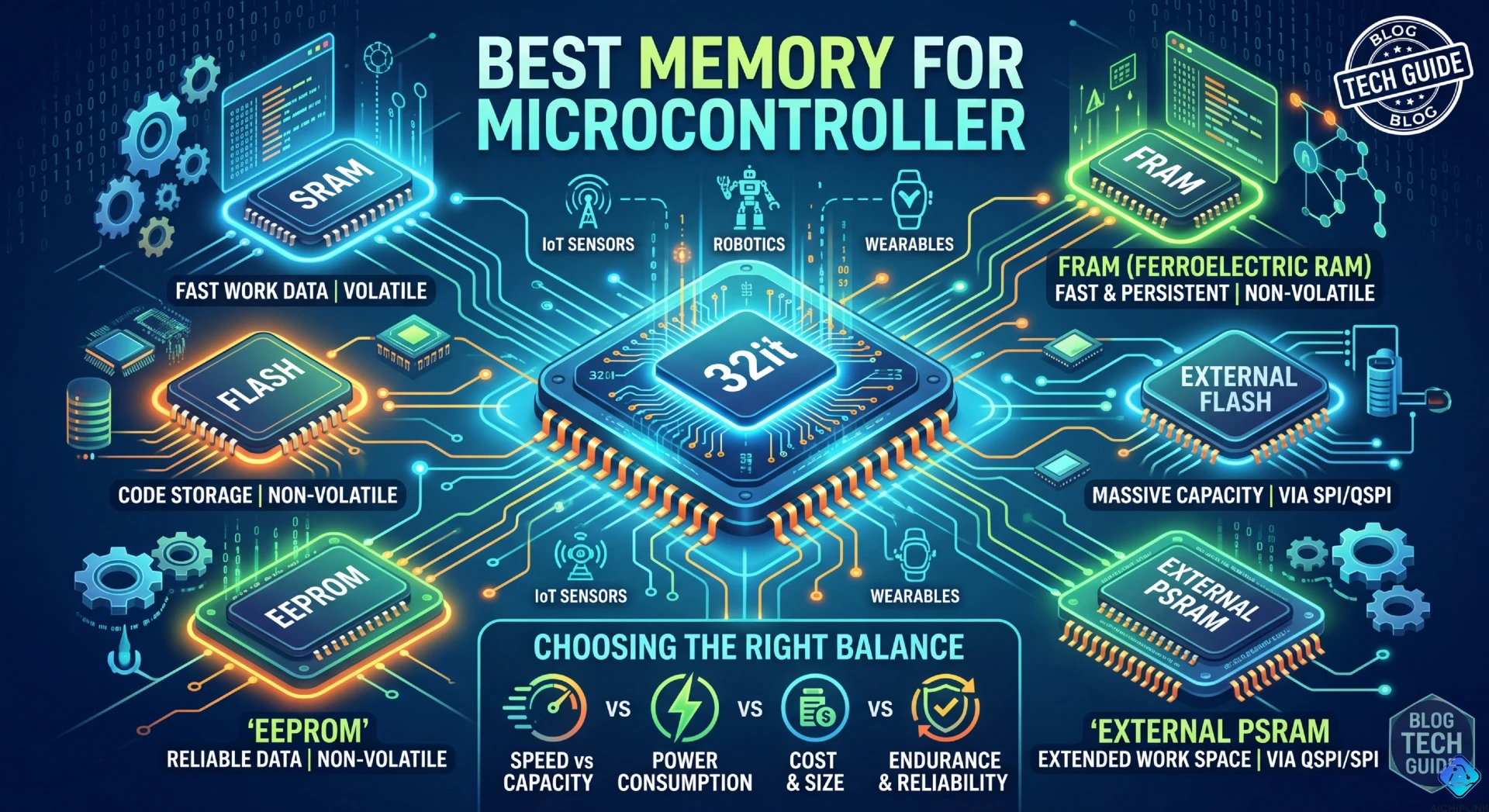 Choosing the right memory for a microcontroller project depends on your application's code size, data retention requirements, speed needs, and power constraints. Modern microcontrollers integrate multiple memory types—Flash for program storage, SRAM for runtime variables, and EEPROM/Flash for non-volatile data—while complex projects may require external memory expansion using SPI Flash, I²C EEPROM, or SDRAM. This comprehensive guide explains the different memory types available for microcontrollers, compares internal versus external memory options, provides specific recommendations by application type (IoT, data logging, real-time systems, etc.), and helps you select the optimal memory configuration for your embedded project.