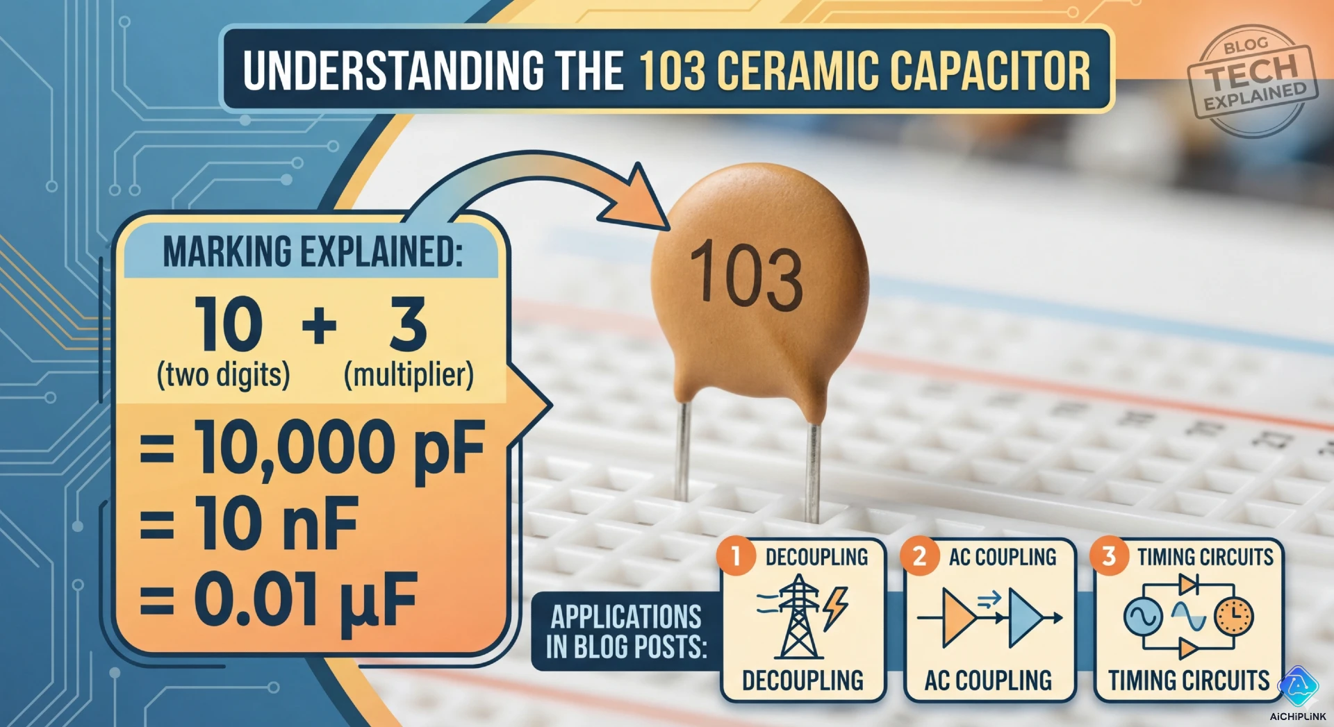 The 103 code is read by taking the first two digits as the base value and using the third digit as a multiplier in powers of ten. Specifically, “10” with a multiplier of 10³ results in 10,000 pF, which converts to 10 nF or 0.01 µF. Additional letters indicate tolerance (e.g., K = ±10%), so “103K” means 10 nF with ±10% tolerance.